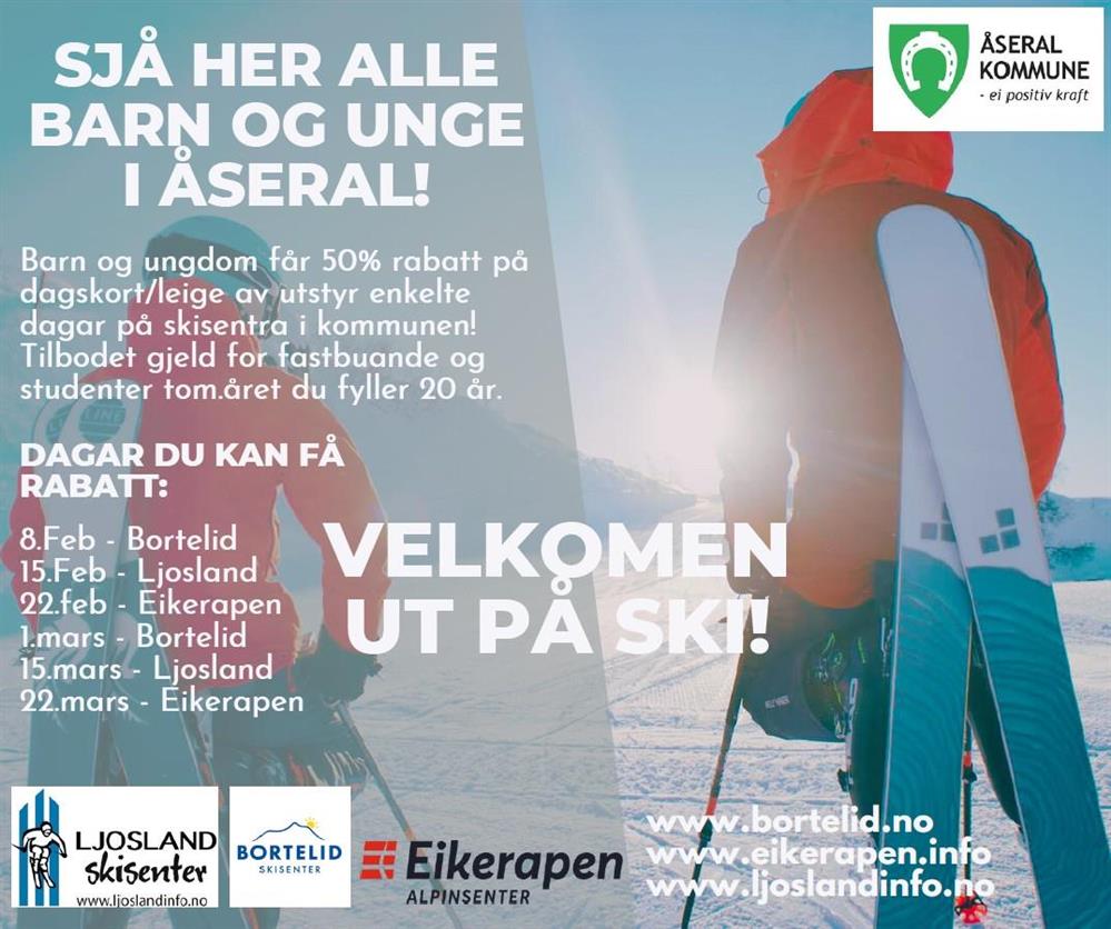 Barn og ungdom får 50% rabatt på dagskort/leige av utstyr enkelte dagar på skisentra i kommunen! Tilbodet gjeld for fastbuande og studentar tom. året du fyller 20 år.